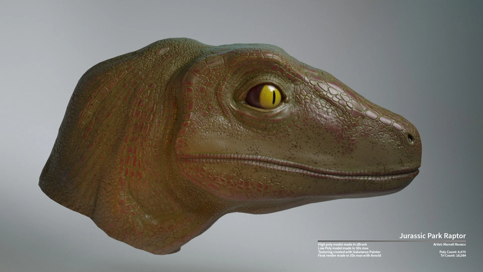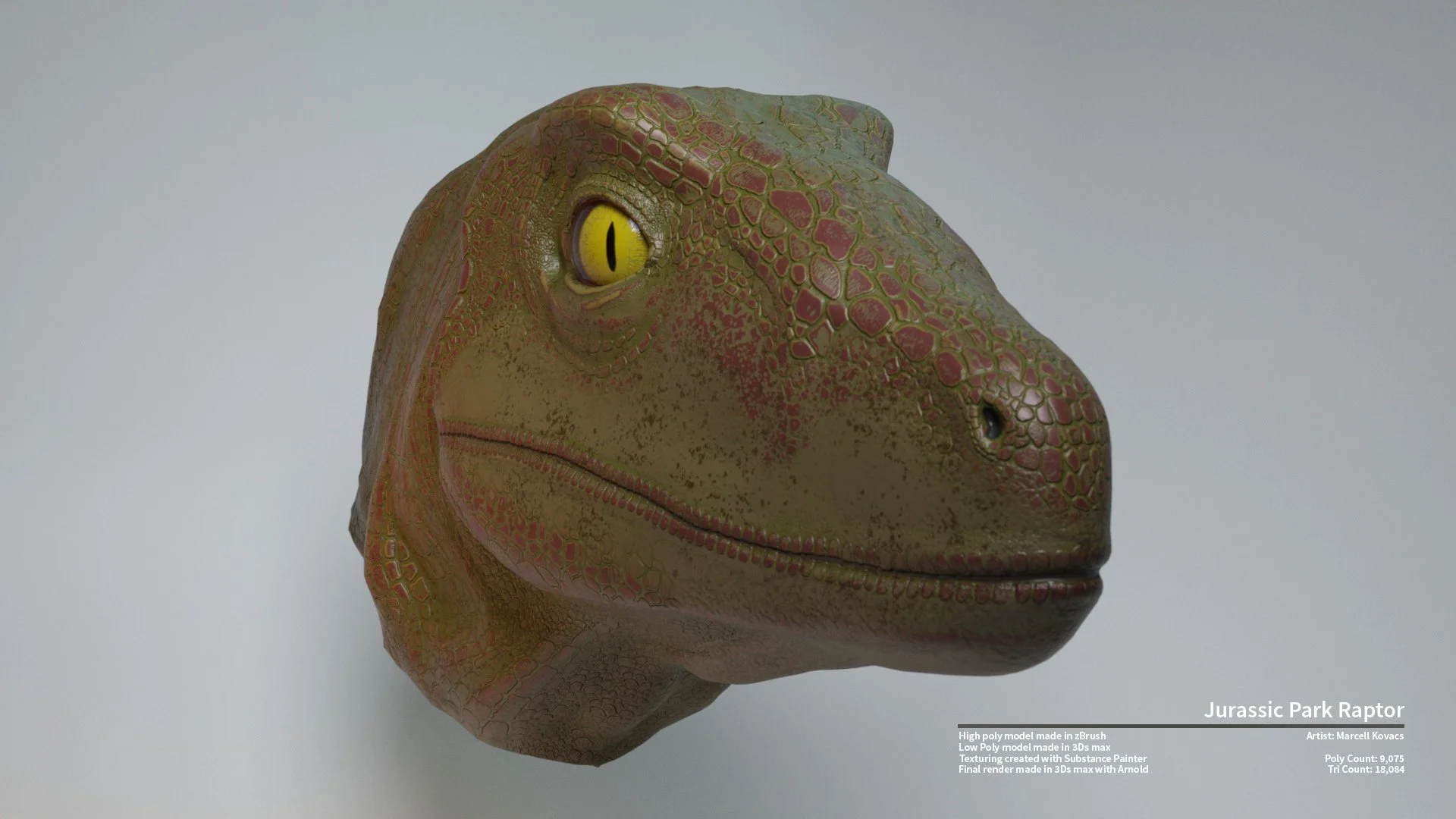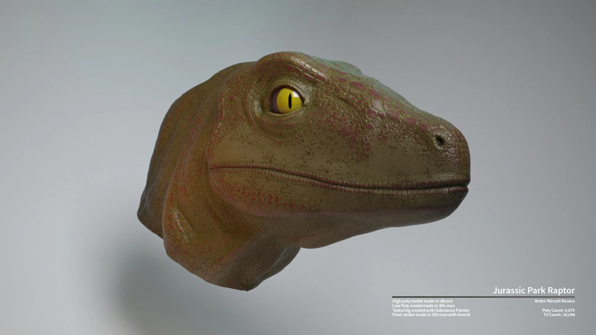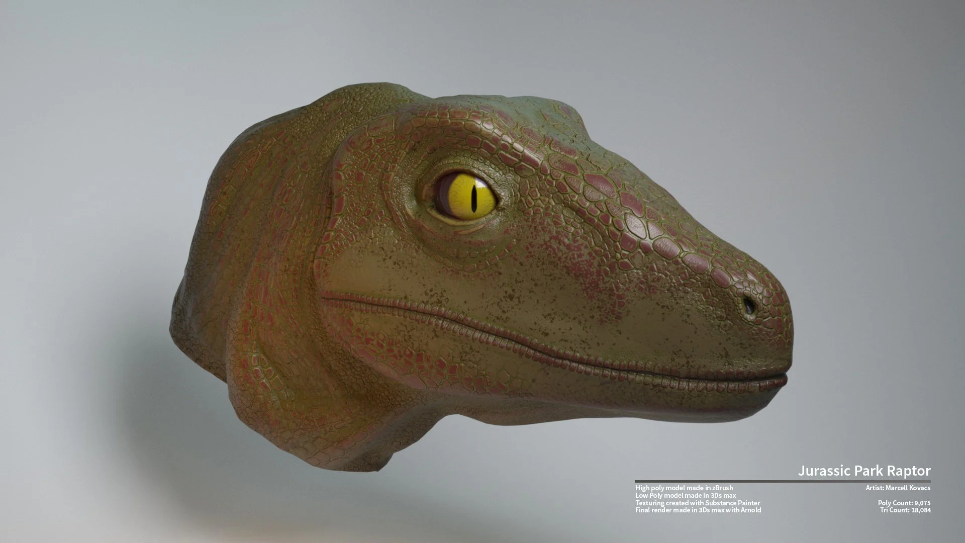 This iteration of a velociraptor head is based on the Jurassic Park version. This raptor is not anatomically correct and is missing key features like a narrow skull and feathers. In this version the raptors skull is much wider and has it’s eyes positioned on the side of its head, and is missing its proto feathers along its neck and at the tops of its head. The raptor was originally started in Zbrush as a high poly model, with all its skin details sculpted with Zbrush. It was than imported into 3D Max where using the step builder tool a low poly was drawn over it. Once finished this low poly raptor head was unwrapped and exported into Substance Painter. From here on all the baking, and texturing was done inside of Substance. Afterwards the model and textures were rendered inside of 3Ds Max using Arnold.
