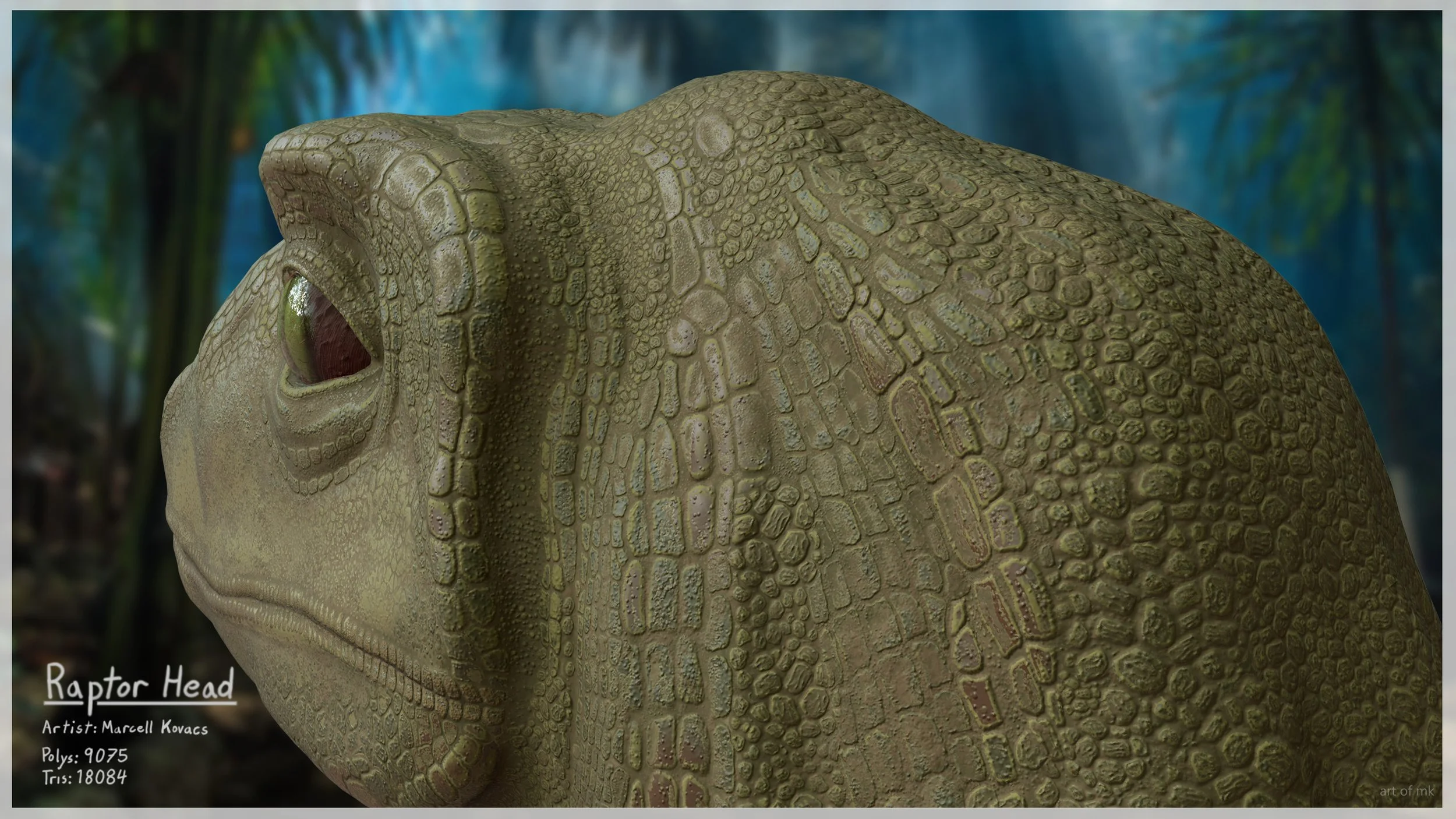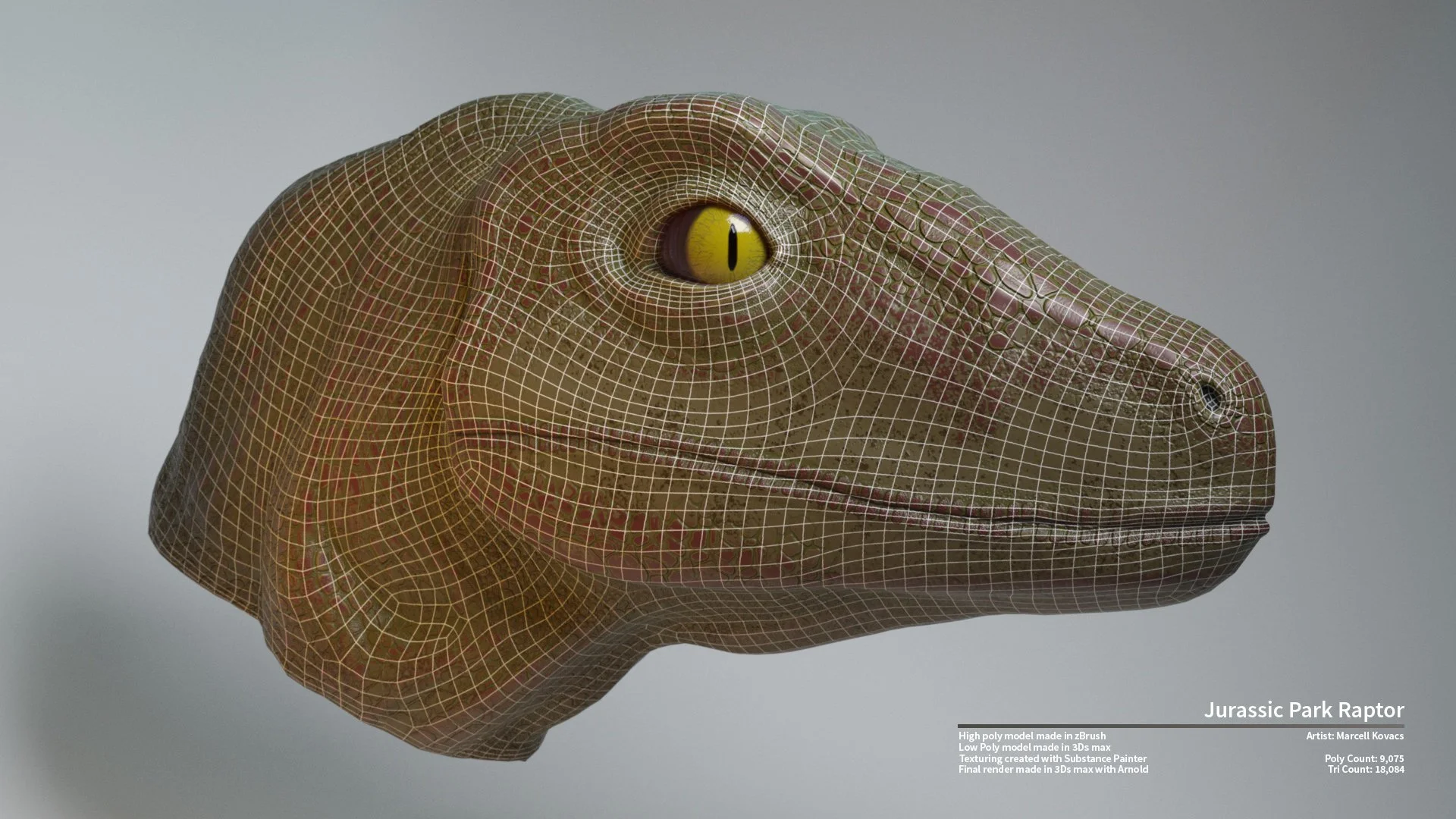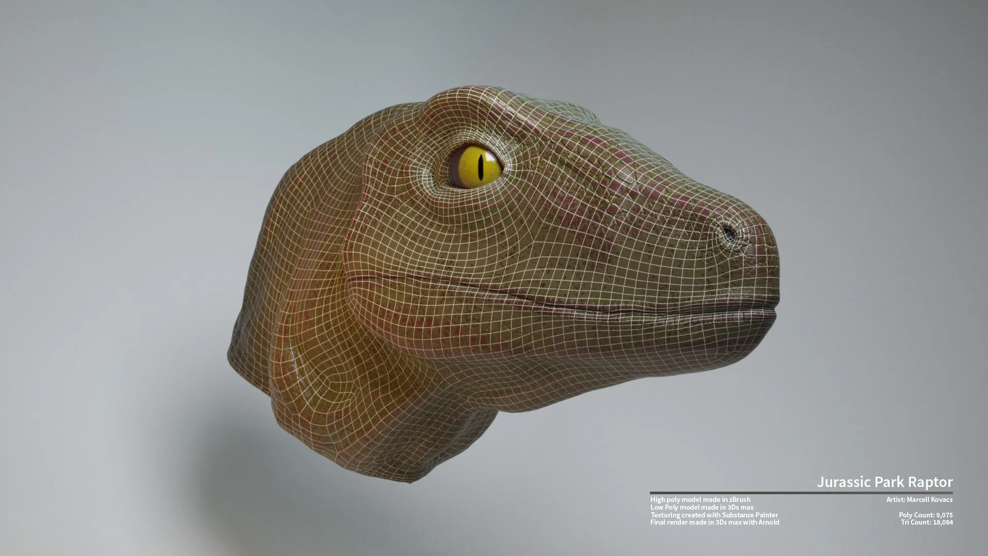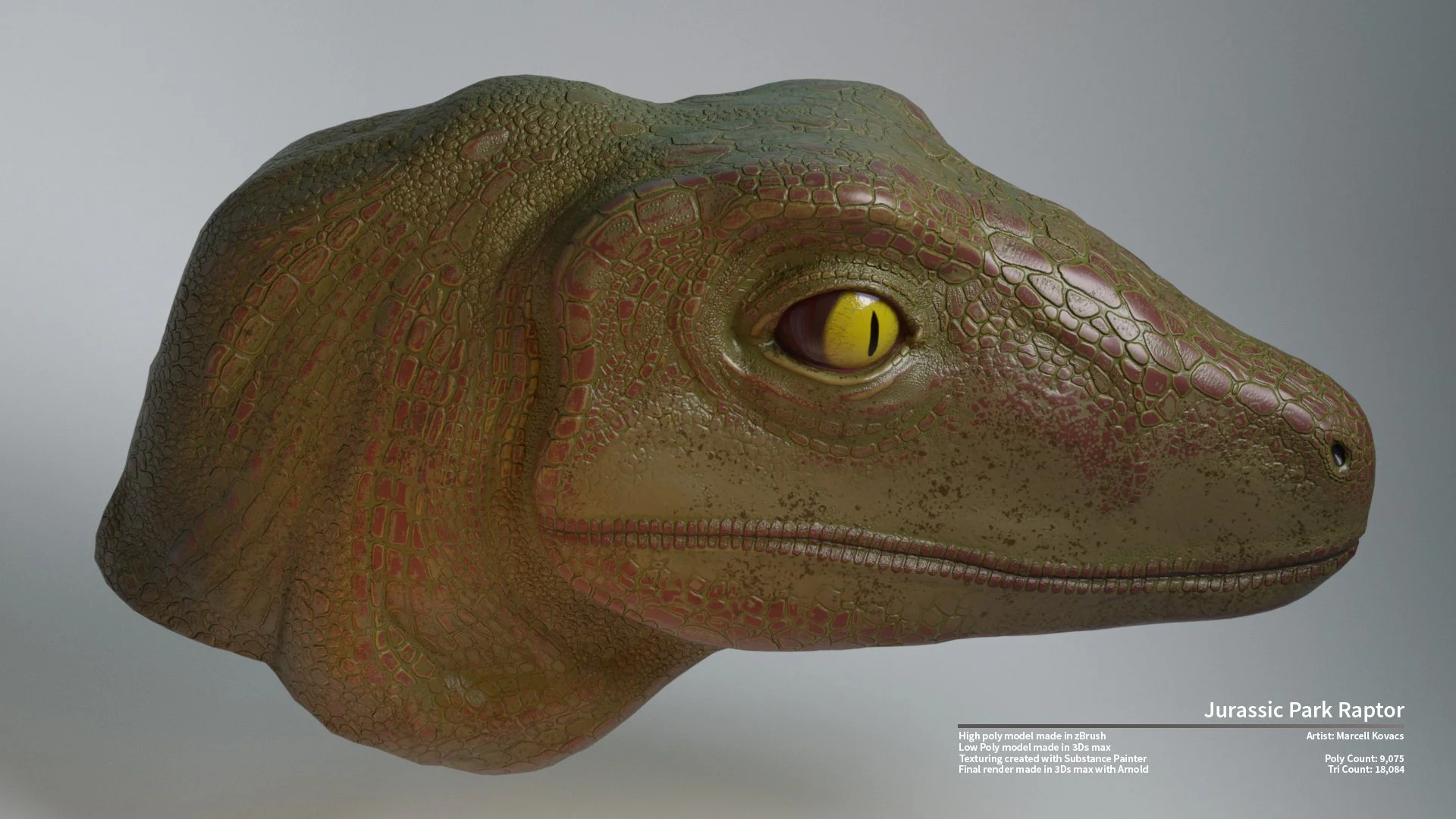 This iteration of a velociraptor head is based on the Jurassic Park version. This raptor is not anatomically correct and is missing key features like a narrow skull and feathers. In this version the raptors skull is much wider and has it’s eyes positioned on the side of its head, and is missing its proto feathers along its neck and at the tops of its head. The raptor was originally started in Zbrush as a high poly model, with all its skin details sculpted with Zbrush. It was than imported into 3D Max where using the step builder tool a low poly was drawn over it. Once finished this low poly raptor head was unwrapped and exported into Substance Painter. From here on all the baking, and texturing was done inside of Substance. Afterwards the model and textures were rendered inside of 3Ds Max using Arnold.